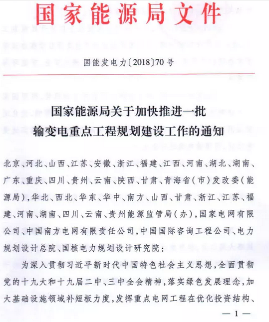 9月7日獲悉,國(guó)家能源局印發(fā)《關(guān)于加快推進(jìn)一批輸變電重點(diǎn)工程規(guī)劃建設(shè)工作的通知》國(guó)能發(fā)電力〔2018〕70號(hào),《通知》指出,為加大基礎(chǔ)設(shè)施領(lǐng)域補(bǔ)短板力度,發(fā)揮重點(diǎn)電網(wǎng)工程在優(yōu)化投資結(jié)構(gòu)、清潔能源消納、電力精準(zhǔn)扶貧等方面的重要作用,加快推進(jìn)青海至河南特高壓直流、白鶴灘至江蘇、白鶴灘至浙江特高壓直流等9項(xiàng)重點(diǎn)輸變電工程建設(shè),合計(jì)輸電能力5700萬(wàn)千瓦(工程見(jiàn)附件)。