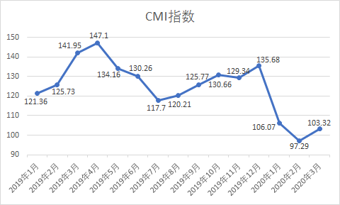 匠客工程機(jī)械數(shù)據(jù)顯示,2020年3月份中國工程機(jī)械市場指數(shù)即CMI為103.32,同比降低27.21%,環(huán)比提高6.20%(依據(jù)CMI判斷標(biāo)準(zhǔn),CMI降略高于衰退點(diǎn)100,市場短期仍受疫情影響,但下滑趨勢減弱)。