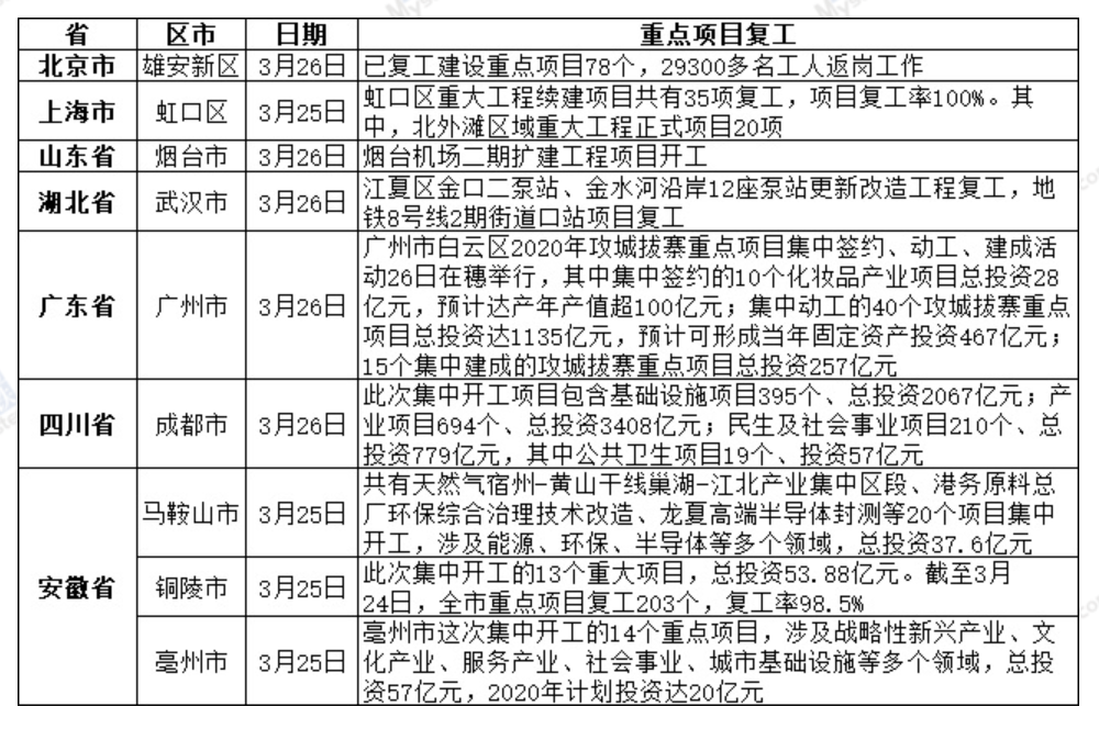 Mysteel統(tǒng)計(jì)數(shù)據(jù)顯示,截至3月26日,27省市規(guī)模以上工業(yè)企業(yè)復(fù)工率超過90%,江蘇、江西、湖南、重慶、新疆等省份人員返崗率超過90%。各地重大項(xiàng)目也陸續(xù)開工。